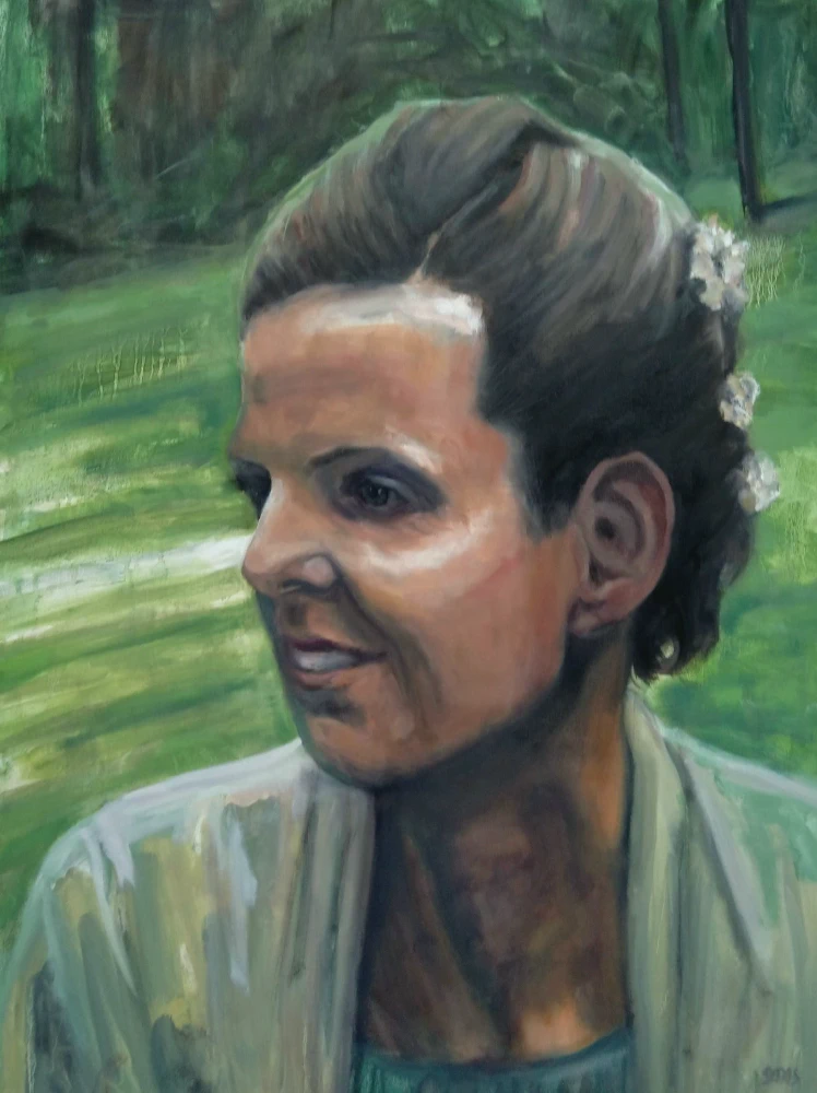 My wife Geke all dressed up for the marriage of her sister in 2017. Painting , 2020Art Series - Contemporary Portraits